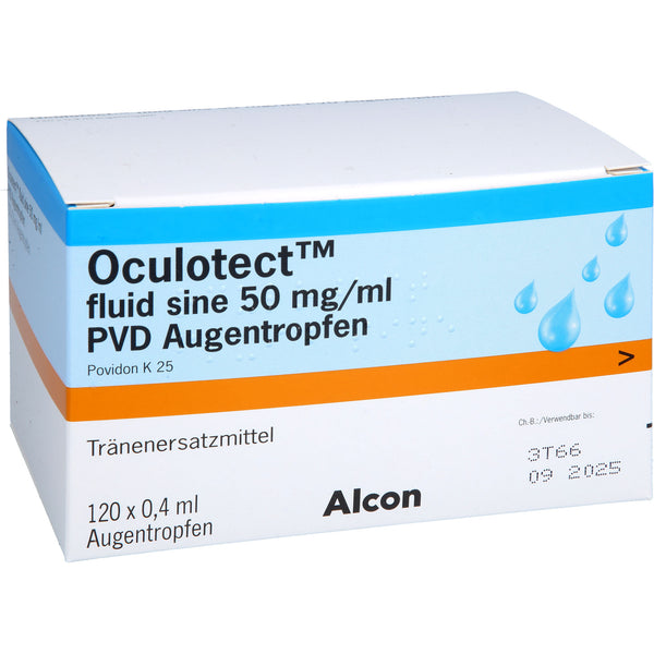 Oculotect fluid sine 50 mg/ml PVD eye drops. Active ingredient: Povidone K 25. Indications: Symptomatic treatment of dry eye syndrome (tear substitute for poor tear film quality or insufficient lubrication of the ocular surface), use as a wetting agent for hard and soft contact lenses.