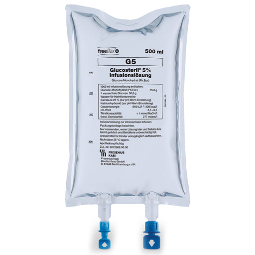 Glucosteril 5% infusion solution. Indications: Carrier solution for compatible electrolyte concentrates and medications, supply of free water.
