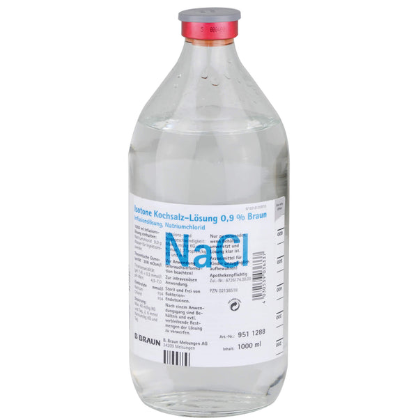 Indications: For replacing fluids and salt in cases of fluid depletion (isotonic dehydration) or simultaneous sodium and fluid depletion (hypotonic dehydration), elevated pH and simultaneously reduced chloride levels (hypochloremic alkalosis), and chloride loss. It is also used: for short-term replenishment of the vascular system (intravascular volume replacement), as a carrier solution for electrolyte concentrates and compatible medications, for wound treatment, and for moistening cloths and dressings.