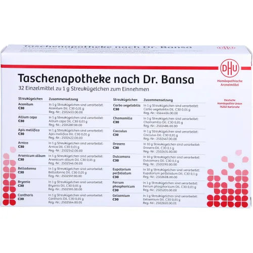 Globules, selected for trained doctors or alternative practitioners, in potency C30. Please note: The high potencies of the pocket pharmacy according to Dr. Bansa should be used after consulting a doctor or alternative practitioner. If persistent, unclear or new symptoms appear during use, a doctor should also be consulted.