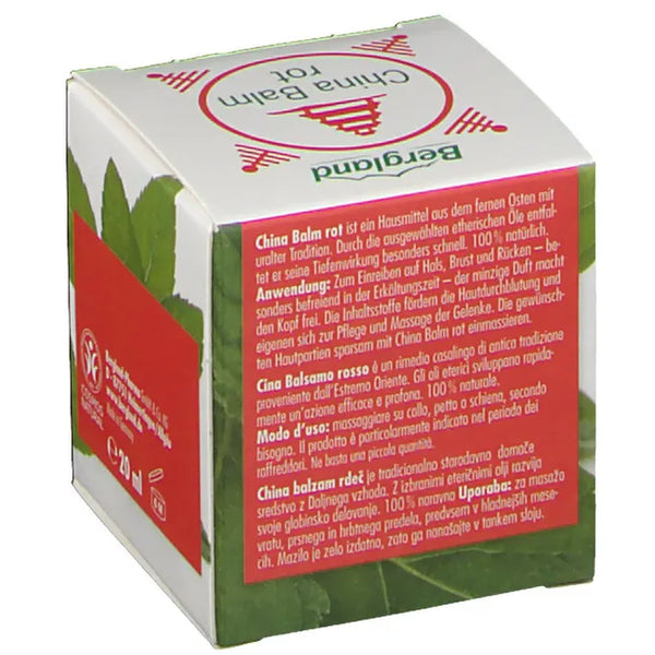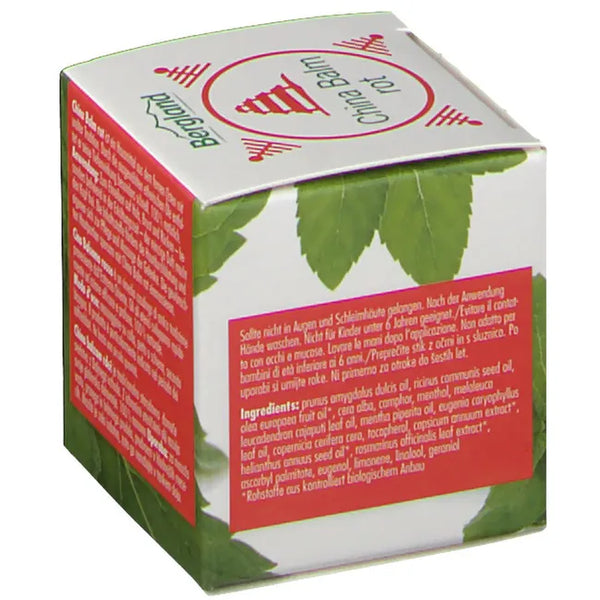 China Balm Red is a household remedy from the Far East with an ancient tradition. Thanks to the selected essential oils, it develops its deep-penetrating effect particularly quickly. Camphor and clove leaf oil stimulate blood circulation in the skin, menthol refreshes, cajeput oil and peppermint oil have an activating and liberating effect. The cold-pressed plant oils and natural beeswax protect the skin from drying out.