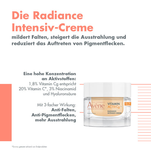 Cell aging leads to a progressive deterioration of tissue function. At the skin level, this results in the appearance of clinical signs such as dryness, pigmentation, sagging, and wrinkles. Avène Dermatological Laboratories have developed the VITAMIN ACTIV Cg Radiance Intensive Cream, which contains three dermatological active ingredients: *Ascorbyl Glucoside, a highly stable form of Vitamin C.