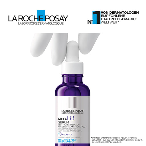The MELA B3 anti-pigmentation serum from La Roche-Posay captures excess melanin before dark spots can even appear on the skin. The patented Melasyl preserves and optimizes every natural skin tone.