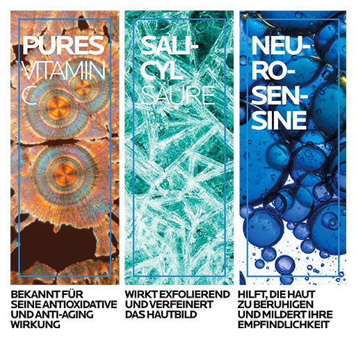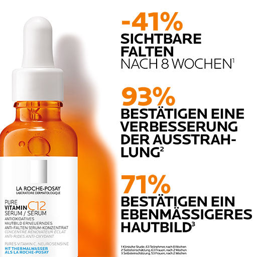 Apply four to six drops of the La Roche-Posay PURE VITAMIN C12 Serum to cleansed skin on the face and neck every morning. Gently pat the serum into the skin with your fingertips. Avoid the eye area and rinse your eyes thoroughly with clean water immediately if the serum comes into contact with them. Always use the Vitamin C Serum in combination with a sunscreen or a day cream with SPF, as Vitamin C makes the skin more sensitive to light. For example, La Roche-Posay's ANTHELIOS Invisible Fluid SPF 30 is a suitable option.
