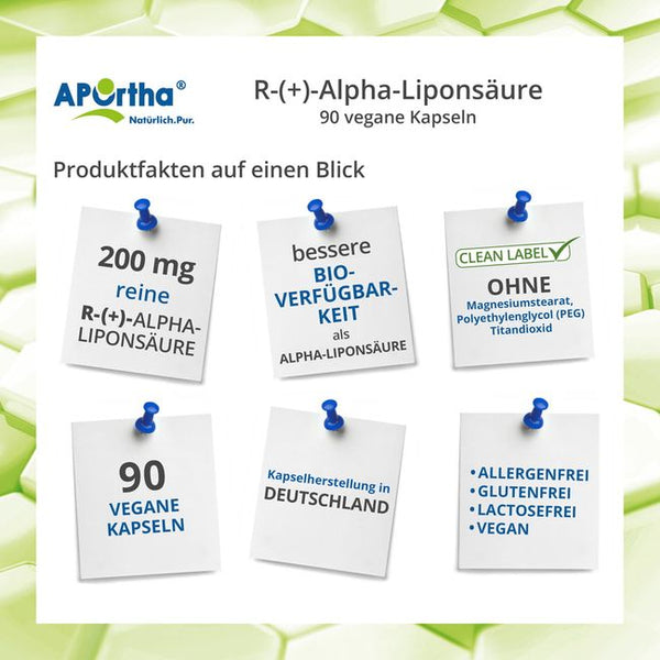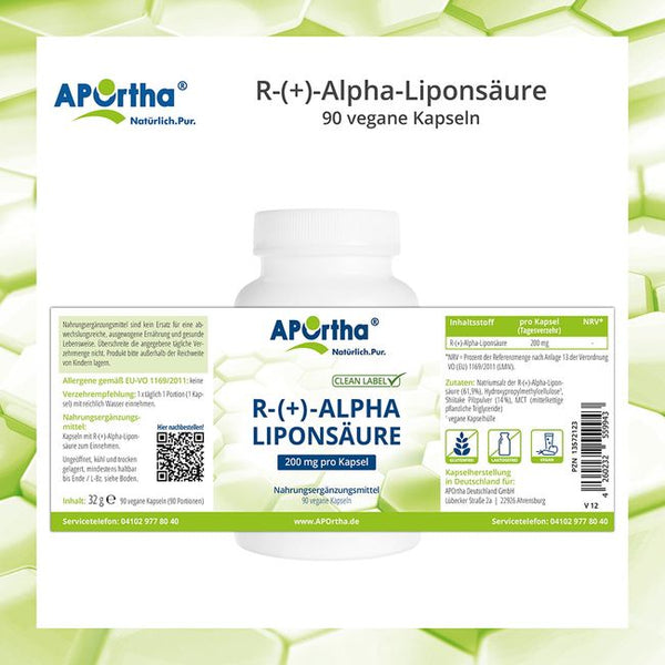 - 200 mg pure R-(+)-alpha-lipoic acid per capsule