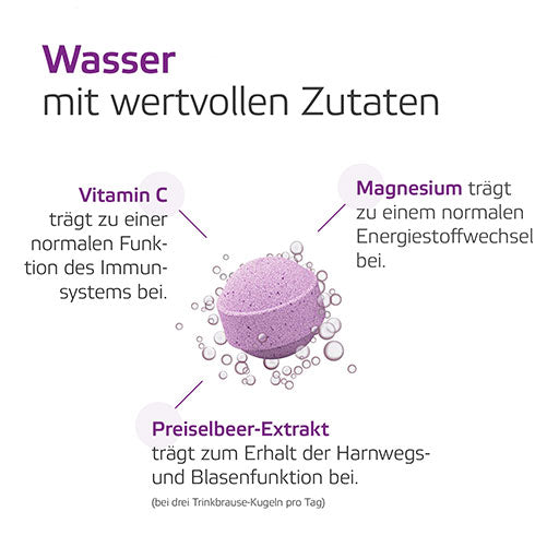 - Cranberry extract, rich in proanthocyanidins, contributes to the maintenance of urinary tract and bladder function (with three effervescent balls per day).