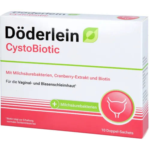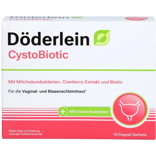 Innovative dual-chamber sachets – stable and effective until use. The innovative dual-chamber sachet from Döderlein CystoBiotic ensures maximum stability of the ingredients by storing them in separate chambers. This separate storage prevents premature reaction and preserves the freshness of the individual components until use. Only when the sachet is opened do the components mix and release their full effect. Biotin (vitamin B7), riboflavin (vitamin B2), and niacin (vitamin B3) contribute to the maintenance of normal mucous membranes. 1 DÖDERLEIN® – The brand for women. For years, DÖDERLEIN® has stood for expertise and trust in the field of female intimate health. Behind our products is a team of experts in gynecology, microbiology, and nutritional science who focus on women's needs. DÖDERLEIN® products are manufactured under the strictest quality standards and are regularly tested through microbiological analyses.