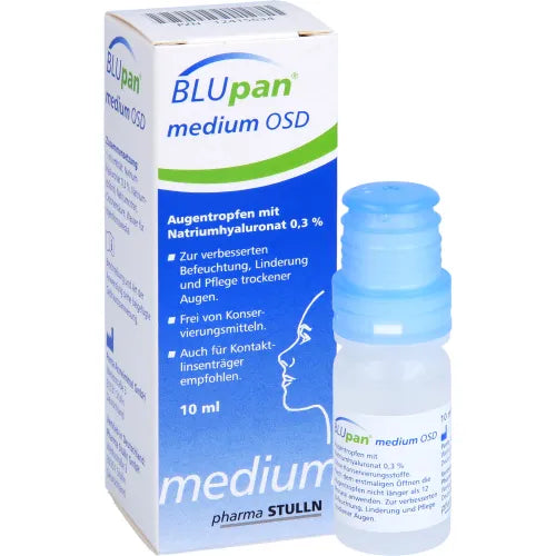 BLUpan medium OSD eye drops form a sterile, preservative-free, viscoelastic, clear protective film for the cornea. BLUpan medium OSD contains sodium hyaluronate, the sodium salt of hyaluronic acid, which, due to its special physical properties, forms a uniform, stable, and particularly long-lasting protective film on the cornea without impairing vision. BLUpan medium OSD thus provides long-lasting relief from symptoms associated with: