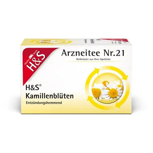 H&S Chamomile flowers. Indications: Traditional internal use: For mild gastrointestinal complaints such as flatulence and mild cramps. Traditional use for inhalation: For the relief of cold symptoms. Traditional oral use: For gargling in cases of mild inflammation of the mouth and throat. Traditional external use: As an additive to partial and sitz baths or rinses, as a supportive treatment for skin and mucous membrane inflammation in the anal and genital areas, provided serious conditions have been ruled out by a doctor. As an additive to moist compresses and washes for mild skin inflammation and superficial wounds. These applications are based exclusively on the long-term use of the medicinal product in the indicated indications. For risks and side effects, read the package insert or consult your doctor or pharmacist. H&S Tee-Gesellschaft mbH & Co. · Heidachstr. 62 · D-88079 Kressbronn/Lake Constance.