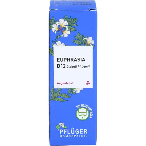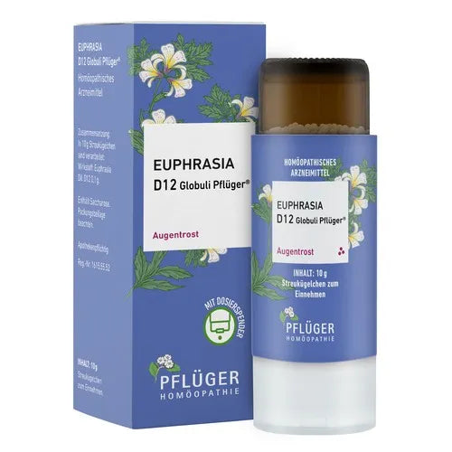 Euphrasia D12 Globules Pflüger®, Composition: 10 g of globules contain: Active ingredient: Euphrasia Dil. D12 0.1 g. Other ingredient: Sucrose. Registered homeopathic medicinal product, therefore without indication of a therapeutic use. Contraindications / Side effects: None known. Contains sucrose. Please read the package leaflet.