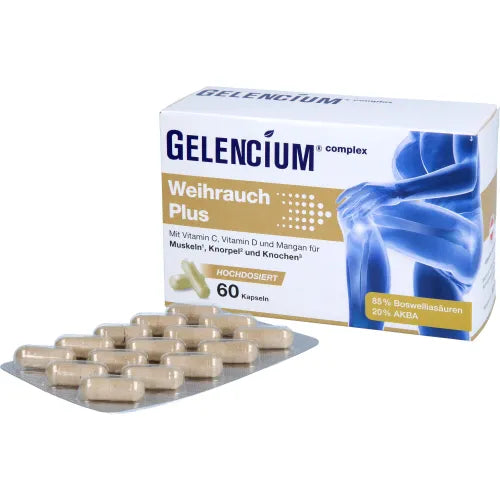 GELENCIUM® Frankincense Plus is a modern, extra-high dose frankincense preparation from the leading osteoarthritis pharmacy brand GELENCIUM® . It combines high-quality Indian frankincense extract (Boswellia serrata) with specially selected micronutrients for joint health. What makes GELENCIUM® Frankincense Plus stand out compared to its competitors is its high daily dose of 1,000 mg. The high content of boswellic acids (85%) and AKBA (20%) ensures exceptionally good absorption of these anti-inflammatory plant compounds. Free from additives and animal-derived ingredients, GELENCIUM® Frankincense Plus is a unique preparation ideally suited for long-term use.