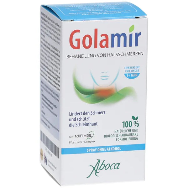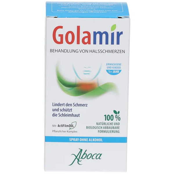 Golamir 2ACT Throat Spray without Alcohol is a plant-based medical device for the treatment of sore throats and irritation of the pharyngeal mucosa caused by viruses, bacteria, allergens, smoke, smog, or dust. It is suitable for adults and children 1 year and older and can also be used in addition to other medical therapies. Thanks to its special mechanism of action, it forms a protective layer on the mucous membrane and relieves irritation.
