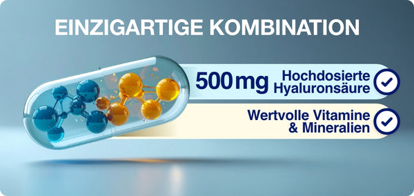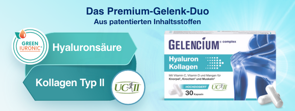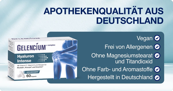 GELENCIUM® Hyaluron Intense is a modern, extra-high-dose hyaluronic acid preparation from the leading osteoarthritis pharmacy brand, GELENCIUM®. For the first time, it combines hyaluronic acid, the natural building block of joints and the main component of synovial fluid, with specially selected micronutrients for joint health. The use of a patented, research-based, high-molecular-weight hyaluronic acid (GREENIURONIC®) ensures excellent bioavailability and joint supply. The optimally balanced micronutrients vitamin C, vitamin D, and manganese further support joint health (cartilage, bones, muscles, and connective tissue). The complete absence of unnecessary additives makes GELENCIUM® Hyaluron Intense ideal for long-term use.