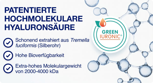 GREENIURONIC® (hyaluronic acid from Tremella fuciformis), capsule shell: hydroxypropylmethylcellulose, calcium ascorbate, manganese gluconate, cholecalciferol