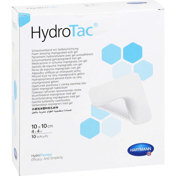 Hydrotac is a foam dressing with a net-like hydrogel layer on the wound side and a water vapor permeable, liquid and germ-tight polyurethane cover film.%%% The absorbent foam quickly absorbs excess wound exudate without drying out the wound.%%% In relatively dry wounds, the hydrogel releases moisture and supports the formation and maintenance of the moist wound environment, which promotes granulation and epithelialization.%%% The wound dressing is soft and supple, has a good cushioning effect and can be removed without pain.%%% Available in various designs and cuts.