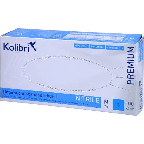 . Kolibri Premium Nitrile Examination Gloves and disposable protective gloves made of nitrile butadiene rubber (NBR). These premium examination gloves are splash-resistant against chemicals, cleaning agents, and liquids. The Kolibri nitrile gloves offer excellent tactile sensitivity and a high level of comfort. They are reversible and have a snug fit.