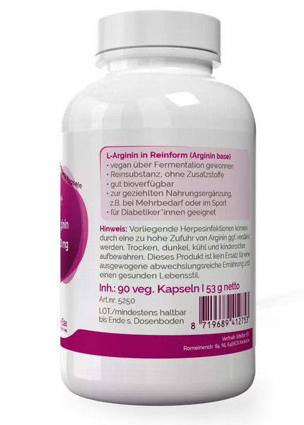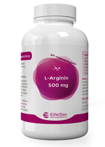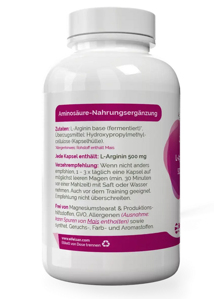 The amino acid L-arginine is very popular among physically active people . Those who have opted for a protein-rich diet but wish to reduce or eliminate their consumption of animal products can easily supplement their daily diet with this vegan arginine supplement from EifelSan
