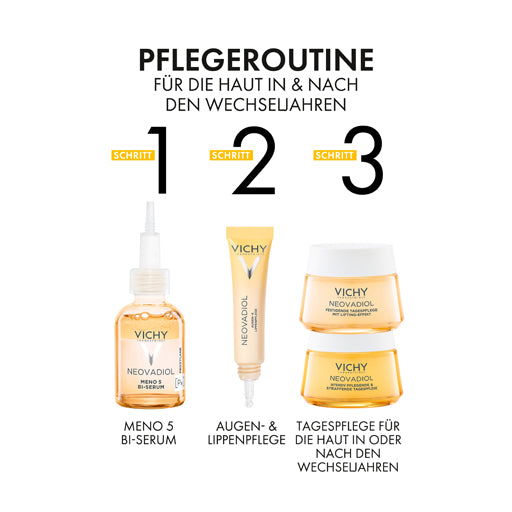 Apply Vichy NEOVADIOL Eye & Lip Care daily, morning and evening, after cleansing the skin. Apply the anti-aging cream for eyes and lips around the mouth, on the eyelid area, under the eyes, and on the sides of the eyes, and gently pat the texture into the skin. When applying, care should be taken to ensure that no product gets into the eyes. This firming eye & lip care is also suitable as a moisturizing treatment for sensitive skin. As a complement to the eye and lip cream, the use of NEOVADIOL 5 Bi-Serum and a NEOVADIOL day or night cream is recommended.