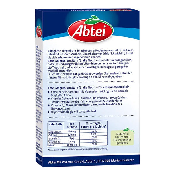 Abtei Magnesium Strong for the Night supports healthy muscle function with calcium and high-dose magnesium. Selected B vitamins such as riboflavin (B2) and niacin (B3) also support muscular energy metabolism and make an important contribution to regulated muscle contraction. The special long-term depot of the magnesium tablets ensures that nutrients are released evenly into the body over several hours – ideal for people with an active lifestyle.