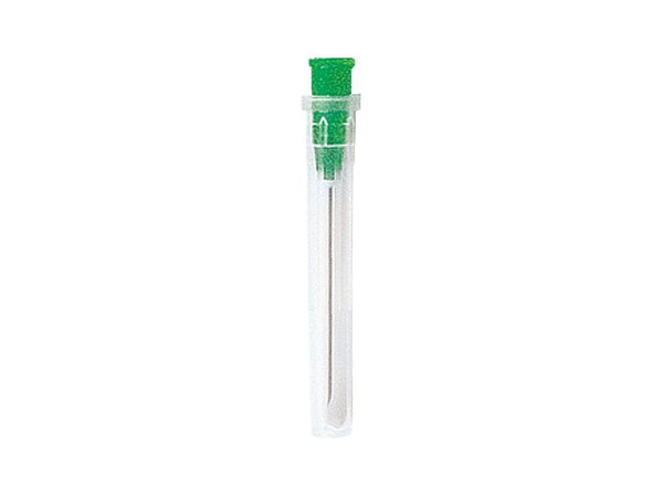 Romed's 0.80 x 40 mm needle features a precision grind for superior sharpness, a polypropylene sheath, and a cap. The cap's color-coded identification facilitates quick identification of the needle size. The product is non-toxic, non-pyrogenic, individually packaged in a blister pack, and sterile.