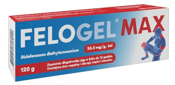The drug Felogel Max contains diclofenac, which belongs to nonsteroidal anti-inflammatory drugs (NSAIDs). It is used to relieve pain, swelling and inflammation in many painful conditions involving joints and muscles. Felogel Max is applied topically to the skin, massaging the gel into the painful areas.